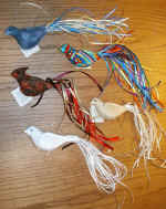 The birds are a modern day version of the glass and feathered Christmas ornament birds that were made in the early 1900’s. The butterflies or “flutterbys” are made from old silk ties. Both of these items are made to hang so they move in the breeze/air. All of the above items were sold in the Smithsonian Museum gifts shops and/or given to friends