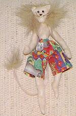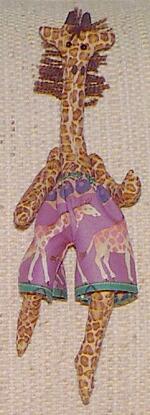 The animals were inspired by the Lion King movie/musical costumes that actors wore with animal heads. All have boxer shorts with their animal picture in the fabric. They range in size from the 10” tall giraffe to about 5-7” for the others. They are fully articulated and can be hung as an ornament or can sit on a shelf.