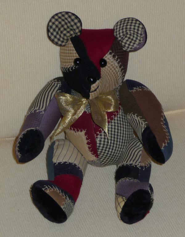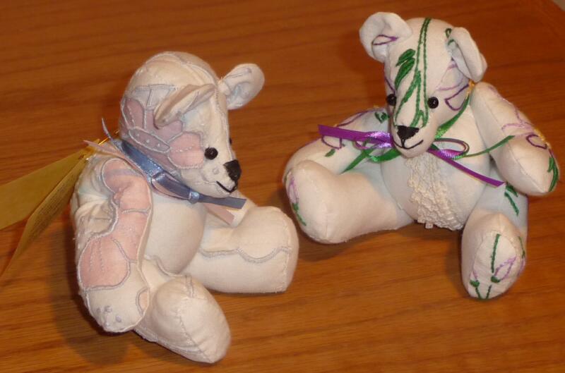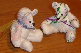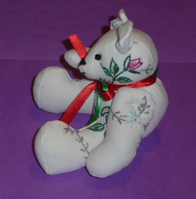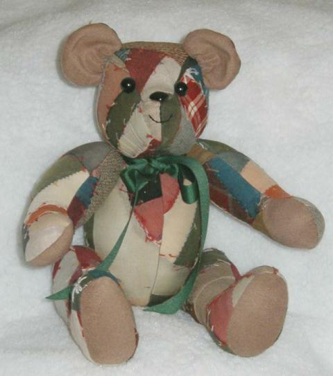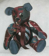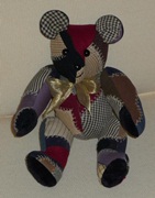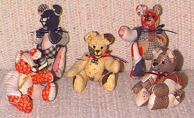The Bears come in 3 sizes – 12”, 8” and 5” in standing positions. The tiny 5” bear is only 3” tall when seated and the most popular. All of the bear sizes have been made from pieces of old, worn and discarded quilts, cut to minimize any damage and are fully articulated. Besides being made from vintage/antique quilt fabrics, the tiniest bears are also fashioned from used embroidered dresser scarves, dish towels, doilies, etc. They are cut and pieced to take advantage of all the lovely hand embroidery work done in the past. The bears were made as gifts for friends and sold in museum gifts shops in Washington, DC and Folsom, CA.